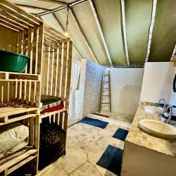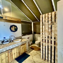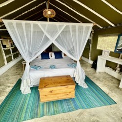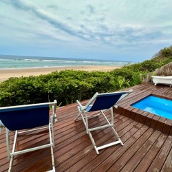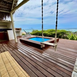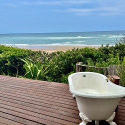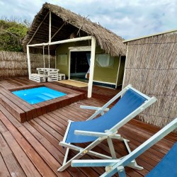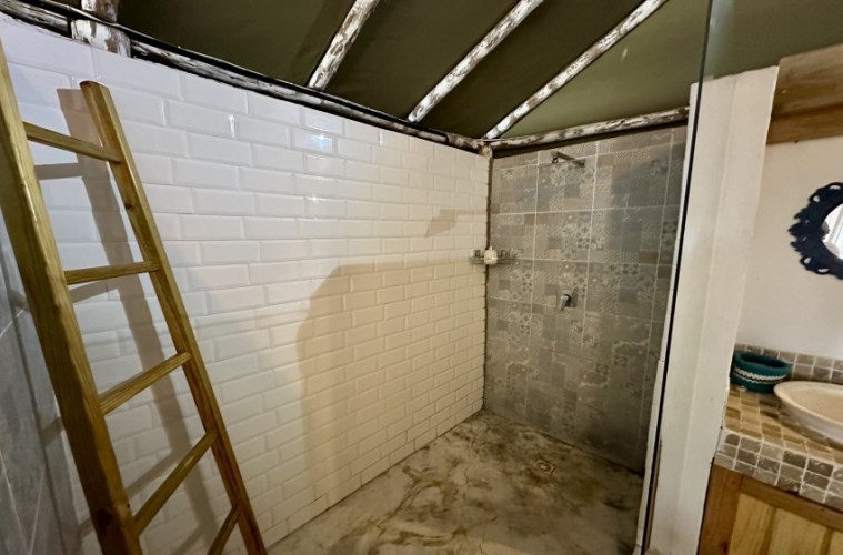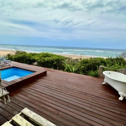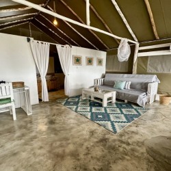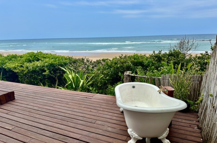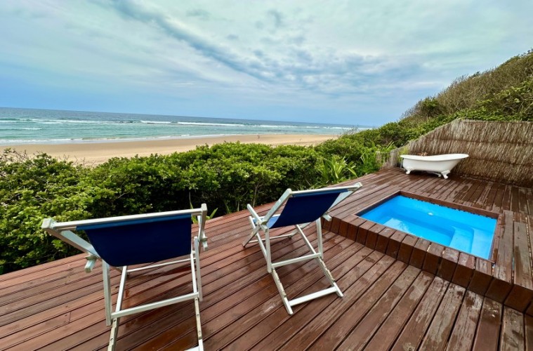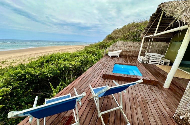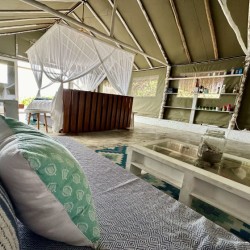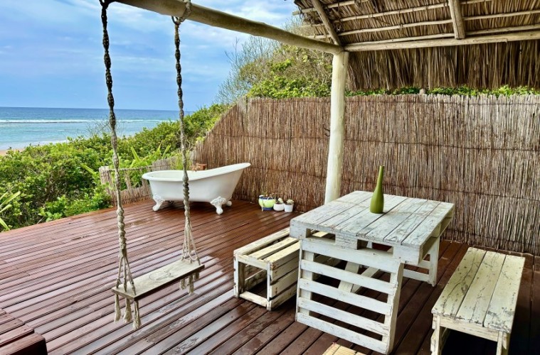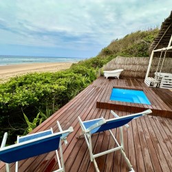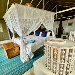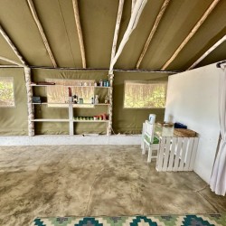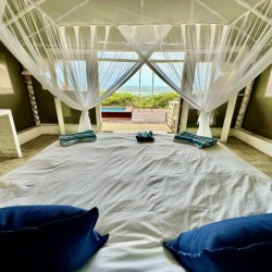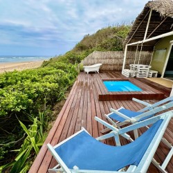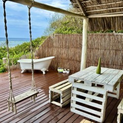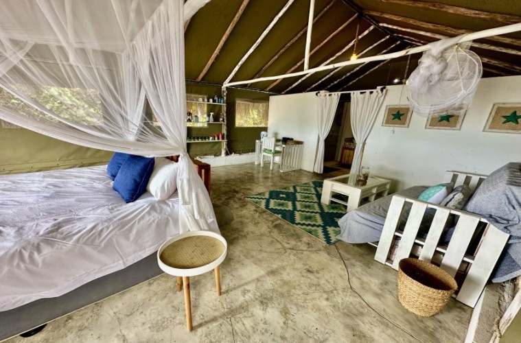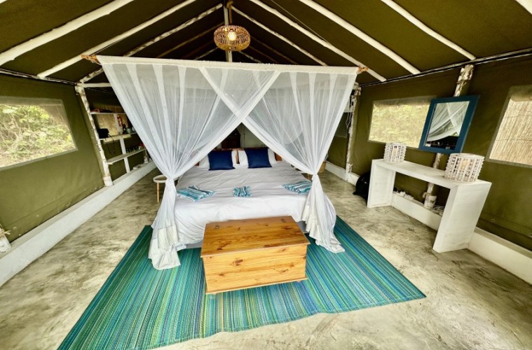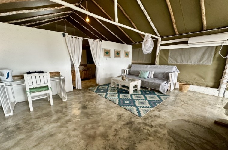 Experience Luxury at Luxury Tent No. 7, Baleia Azul Estate, Ponta Mamoli Escape to a secluded paradise where the bush meets the beach, and luxury seamlessly blends with nature. Welcome to Luxury Tent No. 7, nestled within the serene surroundings of Baleia Azul Estate in Ponta Mamoli. Here, you’ll discover a haven of tranquility and comfort, offering an unforgettable holiday experience. Location: Situated on the picturesque coastline, Luxury Tent No. 7 boasts a prime location that allows guests to immerse themselves in the beauty of nature. Surrounded by lush vegetation and overlooking the azure waters of the ocean, this exclusive accommodation provides the perfect setting for relaxation and rejuvenation. Accommodation: Meticulously designed to provide both comfort and style. The center piece of the tent is a plush king-size bed adorned with soft linen and a cozy Mozzy net, ensuring a restful night’s sleep. The en-suite bathroom features a refreshing shower, double vanity basins, and a toilet equipped with a septic tank system. Guests will also find a single sleeper couch with a Mozzy net, offering additional sleeping space for an extra child or adult. You are also welcome to take a blow up mattress (please bring your own bedding) as there is more than enough room Amenities: Luxury Tent No. 7 is thoughtfully equipped with modern amenities to enhance your stay. Stay cool and comfortable with the air conditioning and fan provided in the tent. Outside, on the spacious deck, guests can indulge in a luxurious bath in the bathtub or take a refreshing dip in the splash pool. The deck also features a 4-seater table and chairs, perfect for enjoying meals al fresco while soaking in the stunning views. Kitchen Facilities: Experience the joy of outdoor cooking in the kitchen located just outside the tent. Prepare delicious meals using the double gas burner and braai, dine under the stars amidst the natural beauty of the surroundings. The kitchen is stocked with cutlery, crockery, pots, pans, and cooking utensils, providing everything you need . Additionally, an outdoor shower offers a convenient way to rinse off after a day of adventure. Connectivity: While Luxury Tent No. 7 offers a retreat from the hustle and bustle of everyday life, guests can stay connected with the outside world by purchasing a local SIM card for full reception at the tent. Immerse yourself in the beauty of nature while staying connected to loved ones or catching up on work if necessary. Activities: Explore the wonders of Fredrico’s reef, located just a stone’s throw away from the tent. During low tide, this pristine reef offers excellent opportunities for swimming and snorkeling, allowing guests to discover the vibrant marine life beneath the surface. Conclusion: Escape to Luxury Tent No. 7 and experience the ultimate blend of luxury, comfort, and natural beauty. Whether you’re seeking a romantic getaway for two or a family adventure by the sea, this exquisite accommodation promises an unforgettable holiday experience. Indulge in the serenity of Baleia Azul Estate and create lasting memories in this idyllic coastal paradise.