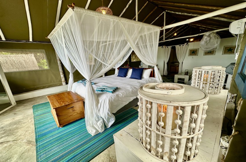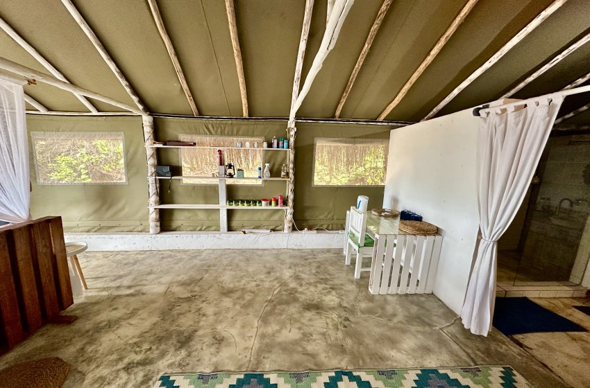 Experience Luxury at Luxury Tent No. 7, Baleia Azul Estate, Ponta Mamoli Escape to a secluded paradise where the bush meets the beach, and luxury seamlessly blends with nature. Welcome to Luxury Tent No. 7, nestled within the serene surroundings of Baleia Azul Estate in Ponta Mamoli. Here, you’ll discover a haven of tranquility and comfort, offering an unforgettable holiday experience. Location: Situated on the picturesque coastline, Luxury Tent No. 7 boasts a prime location that allows guests to immerse themselves in the beauty of nature. Surrounded by lush vegetation and overlooking the azure waters of the ocean, this exclusive accommodation provides the perfect setting for relaxation and rejuvenation. Accommodation: Meticulously designed to provide both comfort and style. The center piece of the tent is a plush king-size bed adorned with soft linen and a cozy Mozzy net, ensuring a restful night’s sleep. The en-suite bathroom features a refreshing shower, double vanity basins, and a toilet equipped with a septic tank system. Guests will also find a single sleeper couch with a Mozzy net, offering additional sleeping space for an extra child or adult. You are also welcome to take a blow up mattress (please bring your own bedding) as there is more than enough room Amenities: Luxury Tent No. 7 is thoughtfully equipped with modern amenities to enhance your stay. Stay cool and comfortable with the air conditioning and fan provided in the tent. Outside, on the spacious deck, guests can indulge in a luxurious bath in the bathtub or take a refreshing dip in the splash pool. The deck also features a 4-seater table and chairs, perfect for enjoying meals al fresco while soaking in the stunning views. Kitchen Facilities: Experience the joy of outdoor cooking in the kitchen located just outside the tent. Prepare delicious meals using the double gas burner and braai, dine under the stars amidst the natural beauty of the surroundings. The kitchen is stocked with cutlery, crockery, pots, pans, and cooking utensils, providing everything you need . Additionally, an outdoor shower offers a convenient way to rinse off after a day of adventure. Connectivity: While Luxury Tent No. 7 offers a retreat from the hustle and bustle of everyday life, guests can stay connected with the outside world by purchasing a local SIM card for full reception at the tent. Immerse yourself in the beauty of nature while staying connected to loved ones or catching up on work if necessary. Activities: Explore the wonders of Fredrico’s reef, located just a stone’s throw away from the tent. During low tide, this pristine reef offers excellent opportunities for swimming and snorkeling, allowing guests to discover the vibrant marine life beneath the surface. Conclusion: Escape to Luxury Tent No. 7 and experience the ultimate blend of luxury, comfort, and natural beauty. Whether you’re seeking a romantic getaway for two or a family adventure by the sea, this exquisite accommodation promises an unforgettable holiday experience. Indulge in the serenity of Baleia Azul Estate and create lasting memories in this idyllic coastal paradise.
