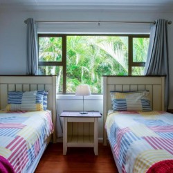 The house is comprised of 1 King bedroom, 2 Queen bedrooms and the 4th bedroom has 2 single beds. All beds are top quality and extra length. There are 3 bathrooms.